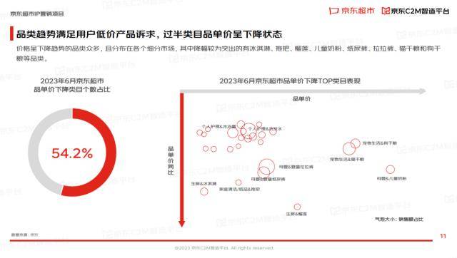在京东超市,平均件单价呈下降趋势的品类众多,占比达到54.2%。且分布在各个细分市场,其中降幅较为突出的有冰淇淋、拖把、榴莲、儿童奶粉、纸尿裤、拉拉裤、猫干粮和狗干粮等品类。