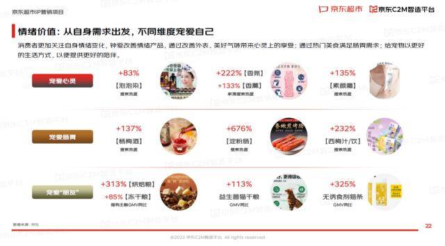 情绪价值,体现在满足自身需求,关注不同层面的自我满足。报告显示,消费者更加关注自身情绪变化,钟爱改善情绪的产品,通过改善外表以及美好气味带来心灵上的享受;通过热门美食满足肠胃需求,例如小小淀粉肠的搜索热度达到了676%;给宠物以更好的生活方式,以便提供更好的陪伴。