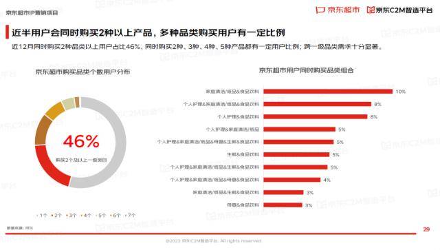 报告显示,京东超市近12月同时购买2种品类以上用户占比达46%,同时购买2种、3种、4种、5种产品都有一定用户比例,跨一级品类需求十分显著。比如同时购买家庭清洁/纸品和食品饮料组合的占比就高达10%。