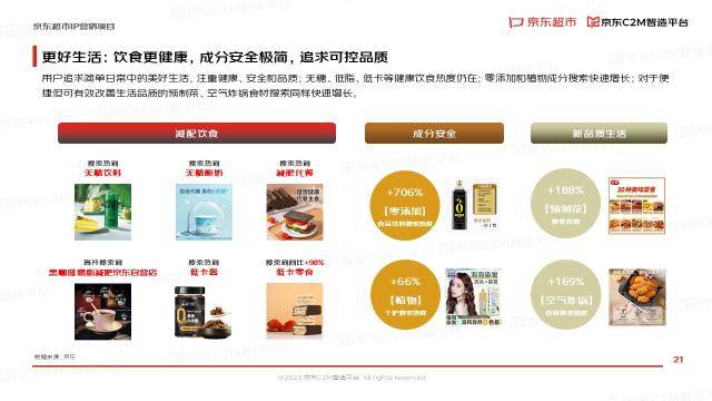 更好生活,体现在饮食更健康,成分安全极简,追求可控品质。报告显示,京东超市的无糖、低脂、低卡等健康饮食热度仍在;零添加和植物成分搜索快速增长,零添加搜索热度提升高达706%;对于便捷但可有效改善生活品质的预制菜、空气炸锅食材搜索同样快速增长。