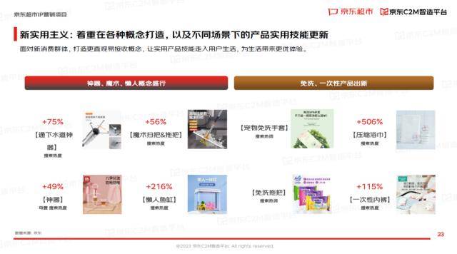 新实用主义则注重各种概念的构建,以及在不同场景下的产品实用性提升。报告显示,神器、魔术、懒人概念盛行,例如懒人鱼缸搜索热度达216%;免洗、一次性产品出新,如压缩浴巾搜索热度高达506%。