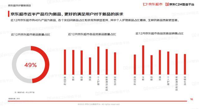 而京东超市近12月来有49%产品为新品,各个类目间新品占比和表现有明显差异,其中个人护理新品占比最高,生鲜的新品贡献更显著。