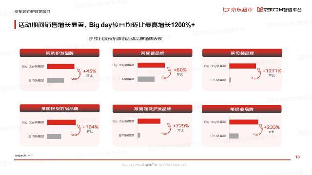 低价优势也带来了销量的增长。京东超市品牌日活动期间销售增长显著,某母婴品牌环比增长达到12倍,某高端洗护发品牌环比增长达到7倍。