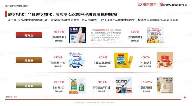 而随着用户需求持续迭代更新,及时准确地洞察市场趋势方向,才能为用户提供更能满足需求的产品。报告显示,京东超市精准捕捉需求趋势,诸多品类在平台呈现高速增长,例如婴幼儿液态奶品类增长高达471%。