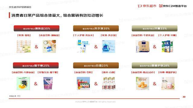 报告显示,消费者日常产品组合体量大,组合营销有效拉动增长。例如,抽纸和调味品重合用户数占调味品的35%,洗发水和洗衣液均购买的消费者达到洗衣液用户的35%。消费者产品组合需求多样,差异化组合活动创造无限机会。例如,个人护理类卫生巾和食品饮料的咖啡重合用户数竟然超过150万,而白酒和婴童护理的用户数也超过100万。