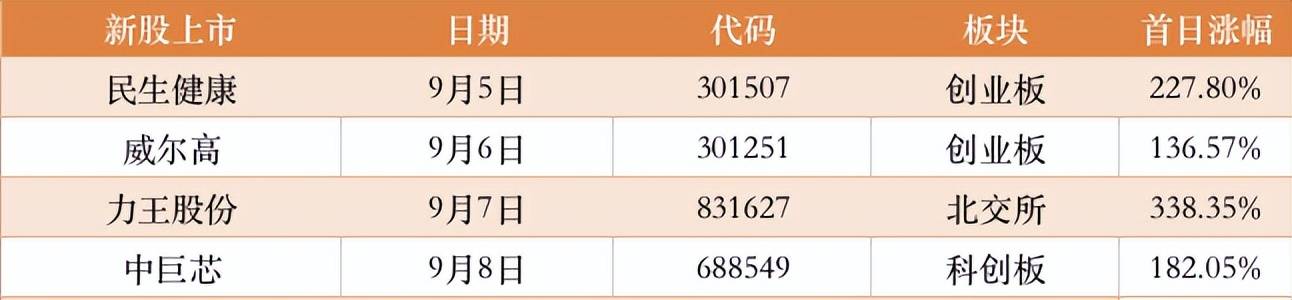 本周,A股共有民生健康等4只新股上市,其中在北交所上市的力王股份首日收盘涨幅338.35%,在创业板上市的民生健康首日涨幅227.80%。