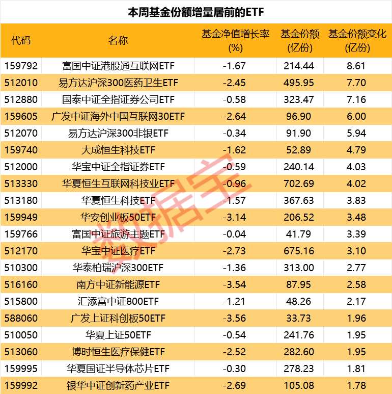 除医药生物主题ETF外,多只互联网、证券等主题ETF也上榜。富国中证港股通互联网ETF、广发中证海外中国互联网30ETF、华夏恒生互联网科技业ETF份额依次增加8.61亿份、6亿份、4.02亿份;国泰中证全指证券公司ETF、华宝中证全指证券ETF等份额也均增加4亿份以上。