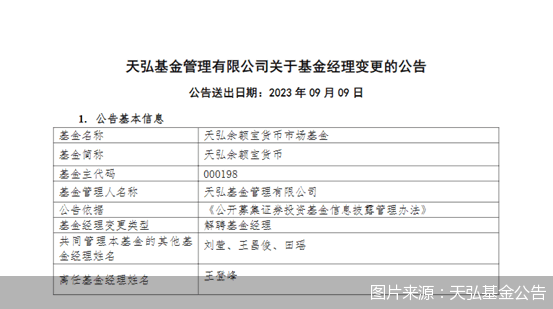 9月9日,天弘基金发布公告宣布,在管天弘余额宝超十年的基金经理王登峰因个人原因离任,由王昌俊、田瑶、刘莹共同管理。同日,王登峰也一并离任了天弘弘运宝货币、天弘云商宝、天弘现金管家货币等产品的基金经理。