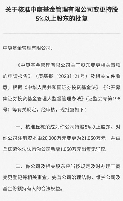 证监会官网披露信息显示,核准丘栋荣依法出资认购中庚基金新增1050万元股份。据了解,丘栋荣持股比例由原来的4.99%提升至9.72%。