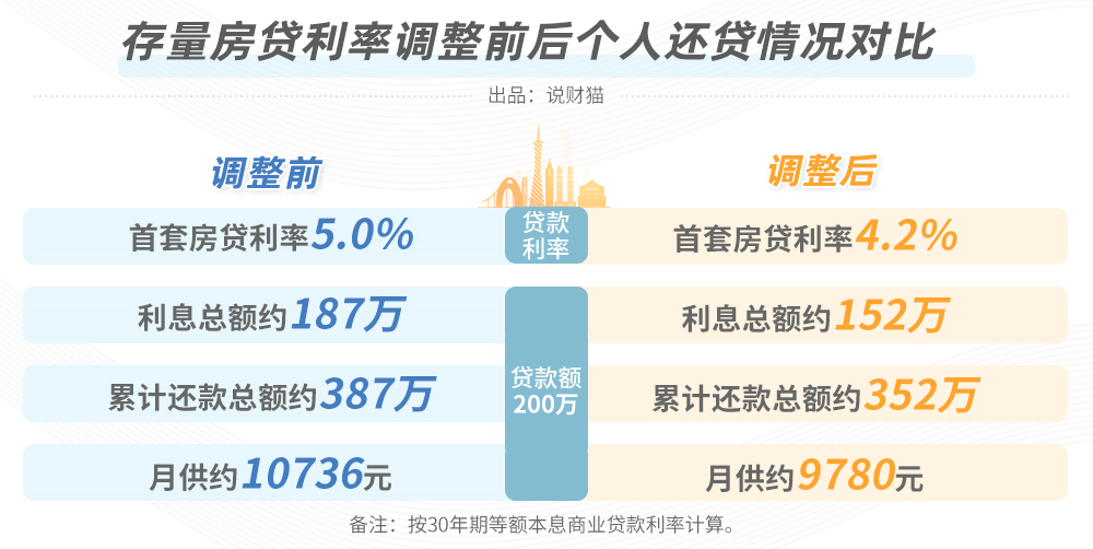 假设贷款200万,贷款利率从5.0%降到4.2%,每个购房者可以少还35万的利息;