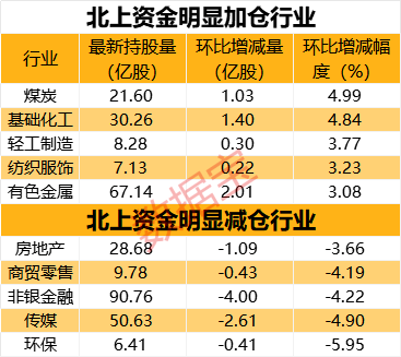 分行业来看,31个行业中13个行业仍获北上资金增持,煤炭、基础化工、轻工制造、纺织服饰、有色金属5个行业持股量环比增幅在3%以上。环保、传媒、非银金融、商贸零售遭到北上资金明显减持,持股量环比下降在4%以上。