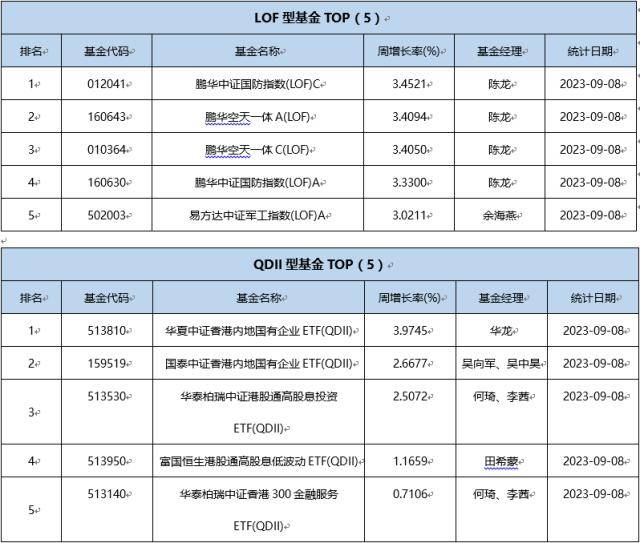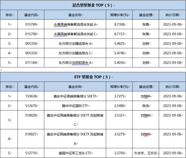 单基金方面,剔除掉创新封基类型基金的影响,上周业绩表现最好的基金为永赢高端装备智选混合发起A,周涨跌幅为8.7308%,为混合型基金;分基金类型看,同样剔除掉分级杠杆及固定收益两类基金的影响,股票型基金冠军为工银瑞信北证50成份指数A,周涨跌幅为4.7630%;债券型基金冠军为博时利发纯债债券C,周涨跌幅为3.0185%; 混合型基金冠军为永赢高端装备智选混合发起A,周涨跌幅为8.7308%; 货币型基金冠军为上银慧盈利货币B,周涨跌幅为0.0859%;ETF型基金冠军为嘉实中证高端装备细分50ETF,周涨跌幅为3.7275%;LOF型基金冠军为鹏华中证国防指数(LOF)C,周涨跌幅为3.4521%;QDII基金冠军为华夏中证香港内地国有企业ETF(QDII),周涨跌幅为3.9745%;下面是不同类型基金周涨跌幅TOP5 (剔除掉分级基金的影响)