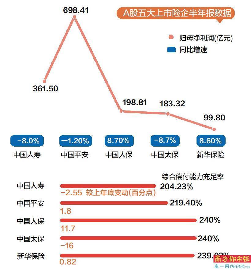 半年报数据显示,新会计准则下,五家A股上市险企呈现出“两升三降”态势。