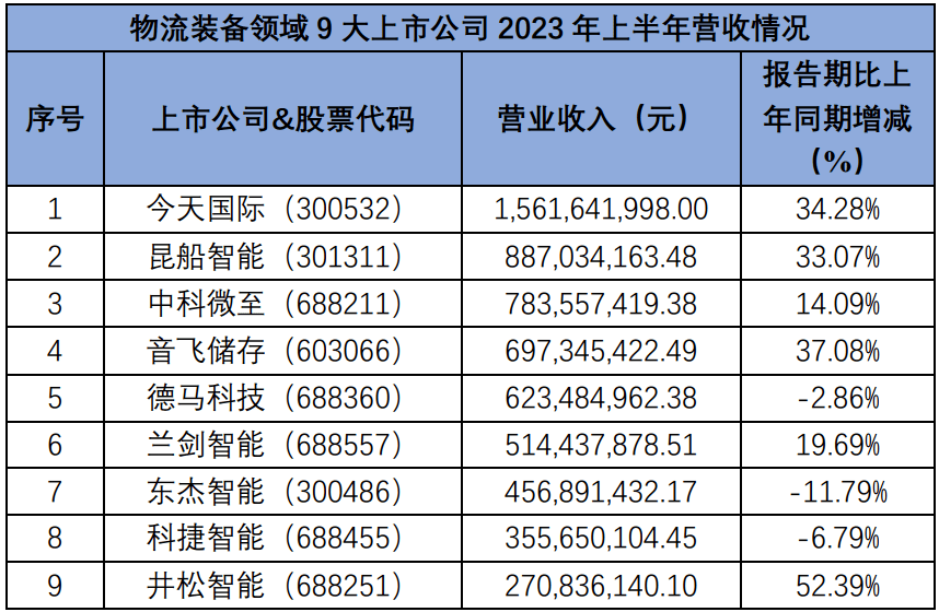 8月,物流装备领域的多家上市公司陆续发布了2023年半年度报告,主要指标汇总如下(根据上市时间先后排列,并附上2022年年度报告作为参考):