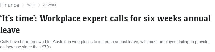 近年来,关于是否应该增加员工年假的讨论在澳大利亚越来越热烈。自1970年代中期Whitlam时代将年假从三周增至四周后,这个数字一直未曾改变。但现在,随着全球的变化和对工作方式的重新思考,似乎到了“撕下创可贴”的时候。