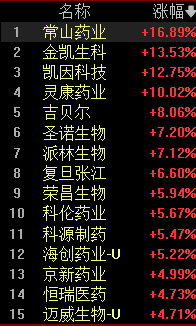 常山药业、金凯生科、凯因科技、灵康药业涨幅超10%,吉贝尔、圣诺生物、派林生物等多股涨超5%。