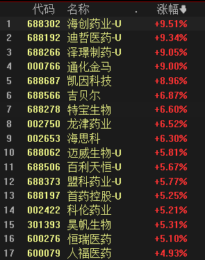 其中,创新药概念股盘初拉升,通化金马涨超5%,泽璟制药、迪哲医药、人福医药、海思科、科伦药业等纷纷拉升。