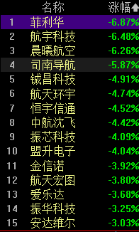 菲利华、航宇科技、晨曦航空跌超6%,司南导航跌5.87%,铖昌科技、航天环宇、恒宇信通等多股跟跌。