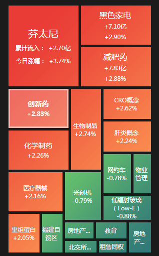 盘面上,芬太尼板块领涨,黑色家电、减肥药、元宇宙、MR等板块涨幅居前,房地产服务、国防军工板块领跌,电子化学品、存储芯片、卫星导航、光刻胶等板块跌幅居前。