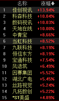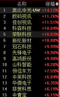 奥比中光大涨12%,科森科技涨停,数码视讯涨超7%,中青宝、佳创视讯、恒信东方等纷纷高开。