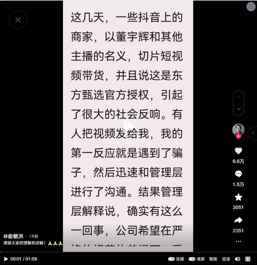 【2000个“董宇辉”账号上线?俞敏洪就“切片带货”致歉】9月9日,俞敏洪在他的短视频账号中发布声明称,东方甄选“切片授权”项目的推进过程有着严重问题。他还称,(该项目)既没有和自己沟通,也没有和主播沟通,还没有预先做好对不良商家的防范措施……已对公司管理层提出严肃批评,同时也对网友造成的困惑表示抱歉。9月7日,东方甄选在抖音上突然冒出了大约2000个带有董宇辉头像和名字的带货账号。点进去一看,全都在用董宇辉的视频切片,然后挂着小黄车卖货。这一事件瞬间刷爆了网络,引发了董宇辉粉丝们的密切关注和热议。(证券时报)