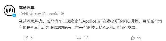 【威马汽车:自愿终止与Apollo出行在港交所的RTO进程】威马汽车官博10日发文称,经过深思熟虑,威马汽车自愿终止与Apollo出行在港交所的RTO进程。目前威马汽车仍是Apollo出行的重要股东,未来将继续支持Apollo出行的发展。(深圳商报)
