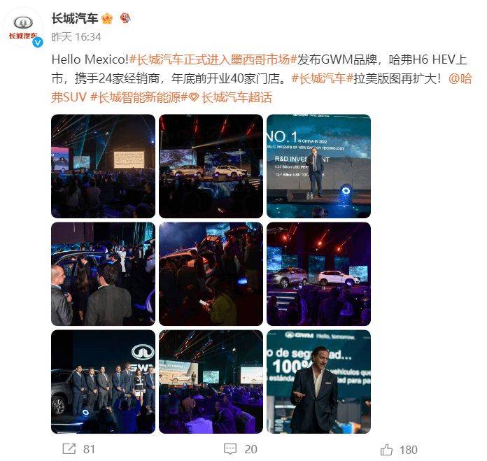 【长城汽车正式进入墨西哥市场】 据长城汽车微博9月9日消息,当地时间9月7日,以“Hello Tomorrow”为主题,长城汽车GWM品牌暨哈弗H6 HEV上市发布会在墨西哥首都墨西哥城举办,标志着长城汽车正式进入墨西哥市场并开始运营。长城汽车已经启动本地化生产的研究和规划工作,深耕墨西哥市场,把GWM打造成真正的本土汽车品牌。(IT之家)