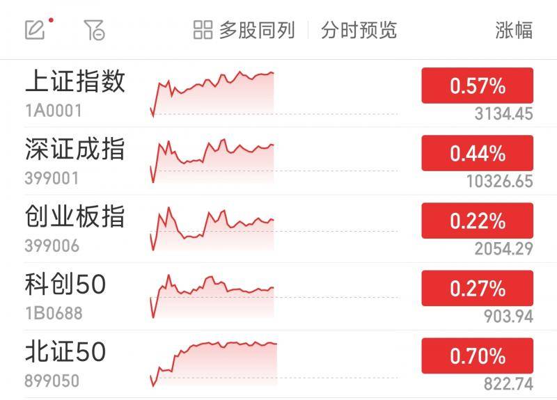 周一,A股三大指数开盘涨跌不一,此后全部翻红上扬。截至午间收盘,上证指数涨0.57%,报3134.45点;深证成指涨0.44%,报10326.65点;创业板指涨0.22%,报2054.29点。沪深两市所有交易个股涨跌比为3436:1622,两市涨停33家,跌停4家。