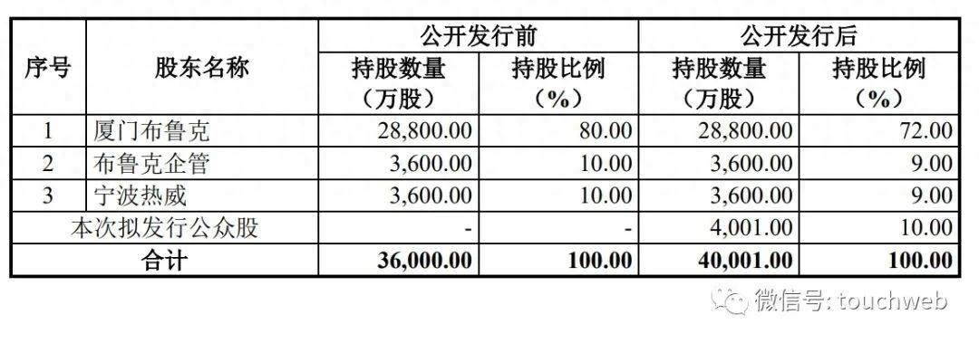 IPO后,热威电热持股为72%,布鲁克企管、宁波热威分别持股为9%。