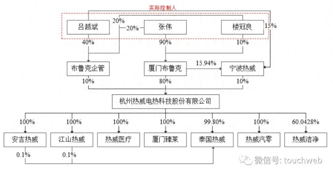 张伟、楼冠良控制的厦门布鲁克持有热威股份80%的股份;厦门布鲁克控制的宁波热威持有热威股份10%的股份;吕越斌控制的布鲁克企管持有热威股份10%的股份。