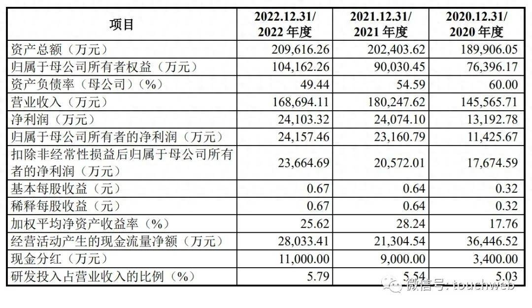 招股书显示,热威股份2020年、2021年、2022年营收分别为14.56亿元、18亿元、16.87亿元;净利分别为1.32亿元、2.41亿元、2.41亿元;扣非后净利分别为1.77亿元、2.06亿元、2.4亿元。