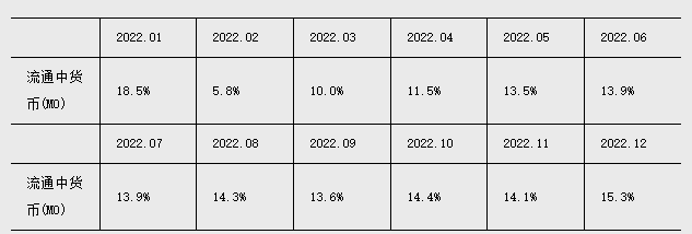 注4:自2022年12月起,“流通中货币(M0)”含流通中数字人民币。12月末流通中数字人民币余额为136.1亿元。修订后,2022年各月末M1、M2增速无明显变化。修订后M0增速如下: