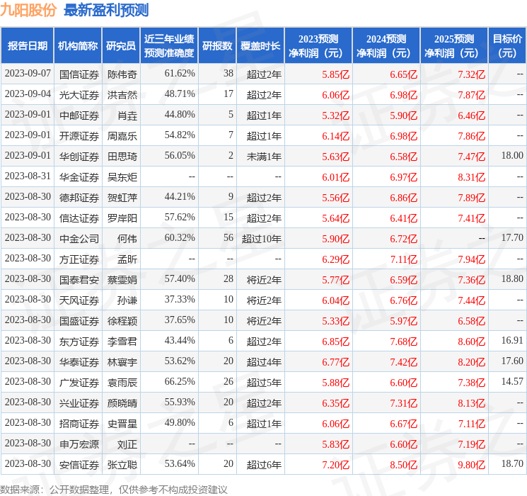 2023年9月11日九阳股份(002242)发布公告称公司于2023年9月8日组织现场参观活动,长江证券崔甜甜、华安基金萧戈言、中银国际资管陈乐天、中信建投自营黎子键、海通资管胡光华、长见投资范永玺、运舟投资袁修恒、安联保险资产刘家仪、上银基金蒋纯文、安信自营苏雅蕙、华创资管丁天参与。