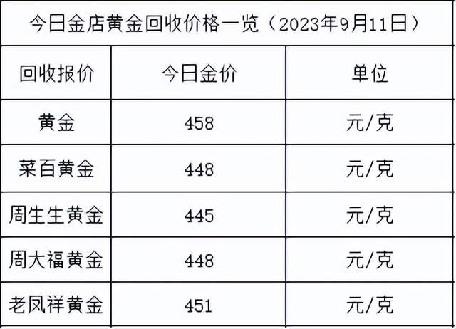 今日金价持稳,黄金回收价格则是微涨,涨幅为1元/克。同时,每个品牌的回收价格也不一样,小金大致整理了几个,详见下表,数据仅供参考: