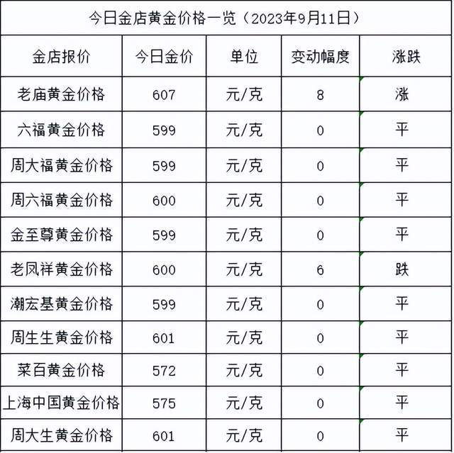 今天是9月11日,大部分金店黄金价格保持不变,但老庙和老凤祥出现大涨大跌,分别上涨8元/吨,下调6元/吨,整体依旧很高。目前,金价最高的金店为老庙,涨幅为8元/克,报价607元/克。而金价最低的金店则依旧为菜百,继续不涨不跌,报价572元/克。今日黄金价格高低差为35元/克,价差较大。