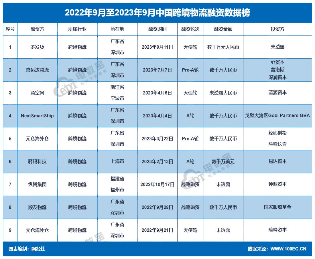 据“电数宝”电商大数据库(DATA.100EC.CN)显示,2022年9月至2023年9月,国内跨境物流领域共发生了9起投融资事件,融资总额约2.3亿元,涉及的公司包括:多发货、喜运达物流、淼空网、NextSmartShip、元仓海外仓、驿玛科技、纵腾集团、顺友物流等。