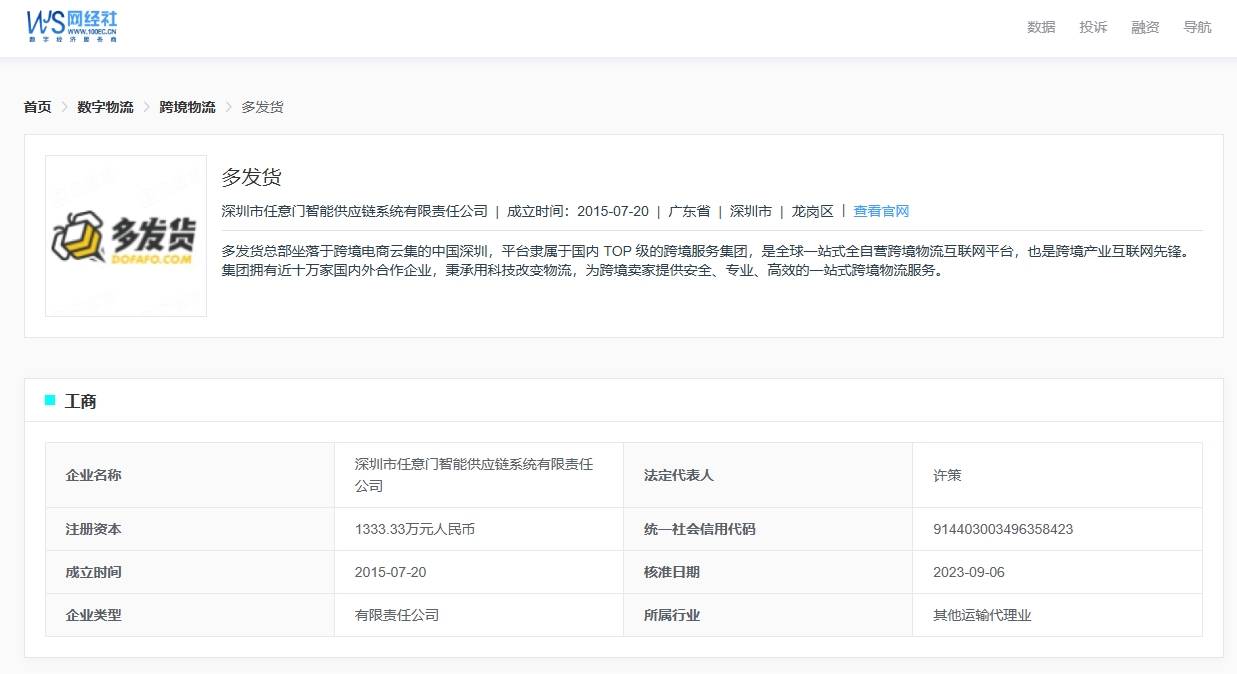 据网经社企业库(COP.100EC.CN)显示,多发货成立于2015年,公司全称:深圳市任意门智能供应链系统有限责任公司,法定代表人为许策,是全球一站式全自营跨境物流互联网平台,也是跨境产业互联网先锋。集团拥有近十万家国内外合作企业,秉承用科技改变物流,为跨境卖家提供安全、专业、高效的一站式跨境物流服务。