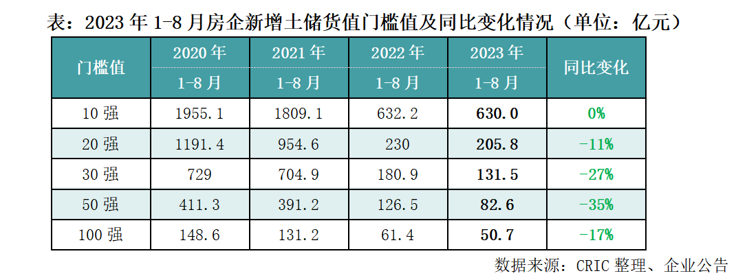 从总量方面来看,1-8月新增货值、总价和建面百强的总额分别为20243亿元、9619亿元和8551万平方米,其中拿地金额同比下降13%。