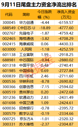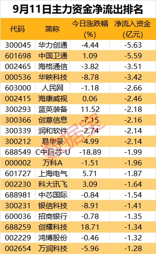 9月最强牛股——在短短9个交易日股价涨幅达到164%的华力创通,今日资金流出5.63亿元,居首位,股价下跌4.44%。中国卫通、海格通信两只卫星导航股资金流出居第二、第三位,分别流出5.59亿元和3.51亿元。