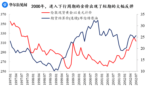 2000年时,黄金价格进入下行周期,金价整体走势偏弱,但在危机爆发时,金价突然大幅反弹,从282.2美元/盎司的价格迅速上涨至310.7美元/盎司的水平。