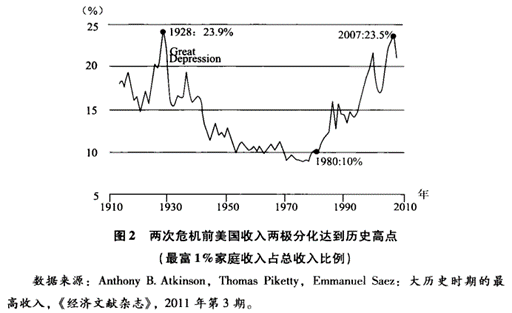 (3)收入分配差距过大是危机的前兆。1928年,美国最富1%家庭总收入占全国总收入比例达到空前的23.9%;2007年达到23.5%。社会资源及财富向小部分人集中,而大众的消费能力被严重侵蚀。在此背景下,富人开设的企业会继续扩大生产,而穷人受经济下行的影响,消费能力会逐渐下降。产能过剩和有效需求不足成为主要的社会矛盾,最终酿成危机。