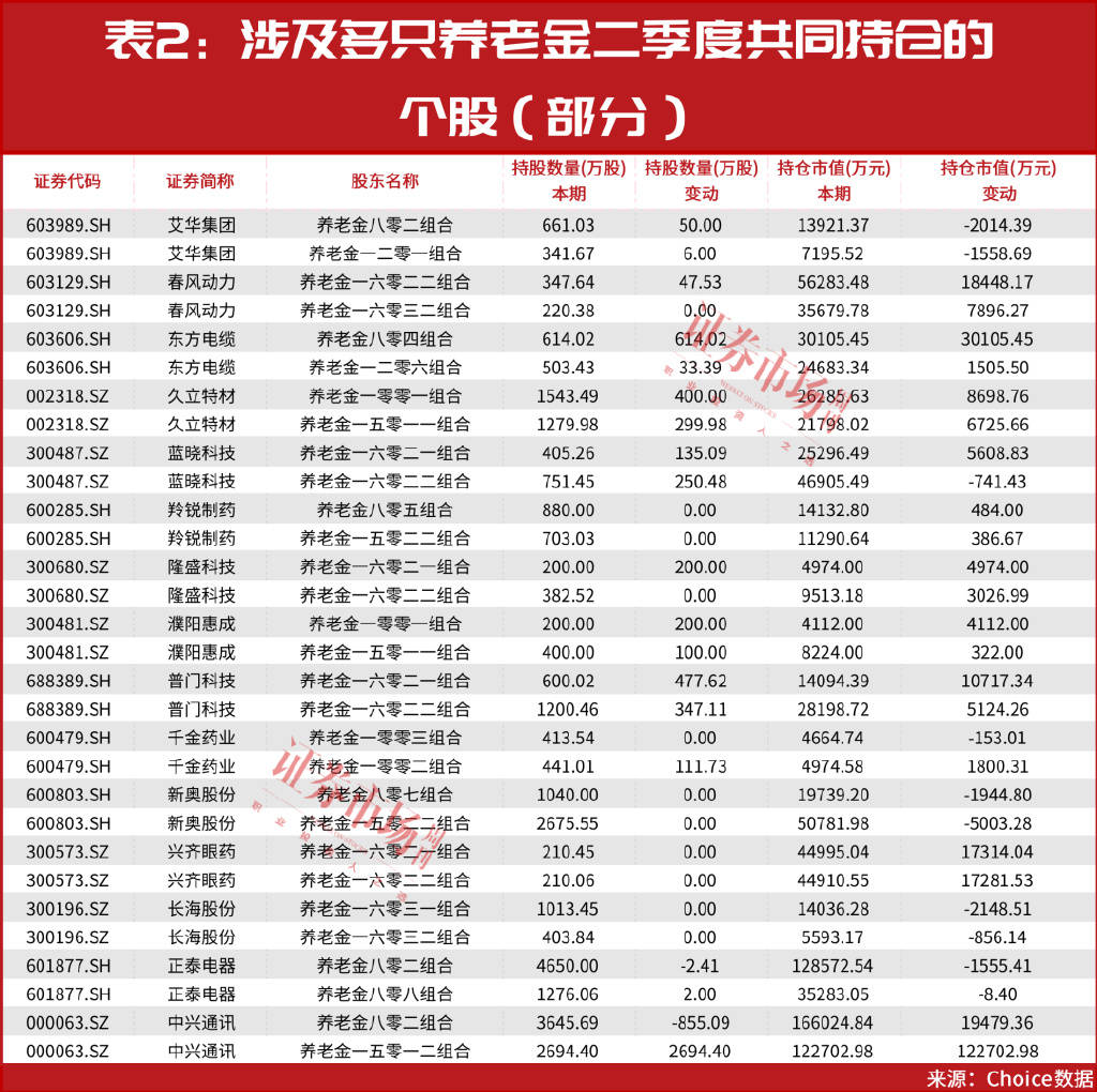 养老金产品账户众多,从上市公司披露的二季度前十大流通股股东持仓来看,不少公司获得了多只养老金产品的联手布局。
