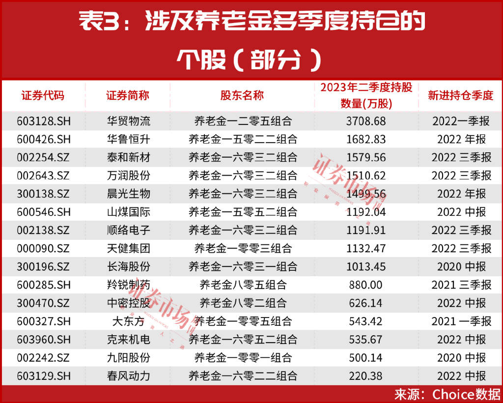 如华鲁恒升,养老金一五零二二组合于2022年年报新进成为其前十大流通股股东,持仓数量为1682.83万股,至2023年中报,持仓数量均未发生变化;再如万润股份,养老金一六零三二组合于2022年三季报新进现身前十大流通股股东,截至2023年中报,持仓数量均未发生变化,一直为1510.62万股。