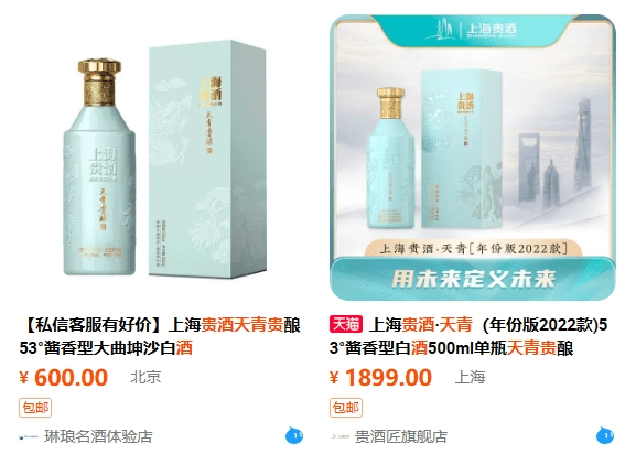 在电商平台上,可以看到零售指导价为1899元一瓶的天青贵酿,与单瓶价格600元的天青贵酿,在同一个搜索页面上共存。有消费者怀疑这个价格的天青贵酿或许不是正品,卖家则说这款酒不出名,没人会造假。