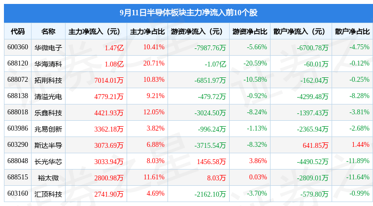 从资金流向上来看,当日半导体板块主力资金净流出11.83亿元,游资资金净流入3900.31万元,散户资金净流入11.44亿元。半导体板块个股资金流向见下表: