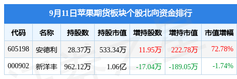 北向资金方面,当日苹果期货板块北向资金持股市值为1.12亿元,增持33.73万元。其中增持最多的是安德利,增持了222.78万元。减持持最多的是新洋丰,减持了189.05万元。苹果期货板块北向资金持股变动明细见下表: