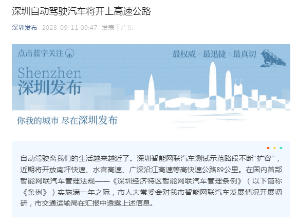 9月11日,另据“深圳发布”的消息显示,其智能网联汽车测试示范路段不断“扩容”,目前已完成首批共89公里高快速路段作为测试示范道路的评估工作。上述路段拟于近期开放,其中包括13公里高复杂度路段。