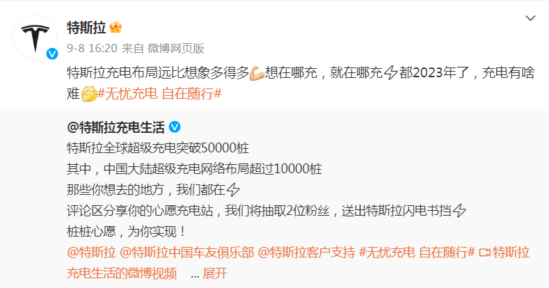 9月8日,特斯拉官方微博发布消息称,特斯拉全球超级充电突破50000桩,其中,中国大陆超级充电网络布局超过10000桩。