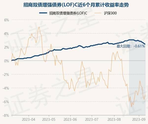 9月11日,招商双债增强债券(LOF)C最新单位净值为1.492元,累计净值为1.631元,较前一交易日下跌0.07%。历史数据显示该基金近1个月下跌0.27%,近3个月上涨0.4%,近6个月上涨2.33%,近1年上涨2.4%。该基金近6个月的累计收益率走势如下图: