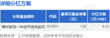 9月12日发布《博时富恒纯债一年定期开放债券型发起式证券投资基金分红公告》。本次分红为2023年度的第3次分红。公告显示,本次分红的收益分配基准日为9月9日,详细分红方案如下: